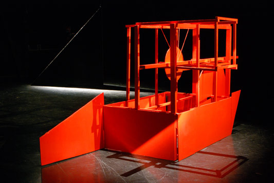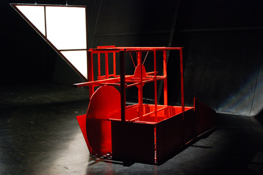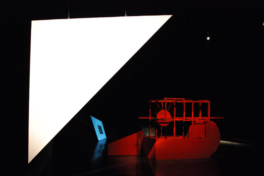 Après avoir digéré le cube noir de Fuksas, nous nous sommes beaucoup intéressés à l’aspect "théâtral" de cet endroit. Nous sommes alors partis avec l’idée d’éclater littéralement un rideau de scène de Malévitch (La Victoire sur le soleil, 1913, 2ème acte, 5ème scène) pour entrer dans une exposition qui présente des pièces "d’arrière-scène". Nous entendons par là des oeuvres déjà existantes et portant le récit de l’aventure TIALABTWCATBS.
